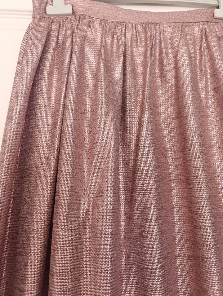 Parlak pembe yılan desenli, sentetik kumaştan pilili uzun etek. Salaş kesimi ve çağdaş tarzıyla parti için uygun.