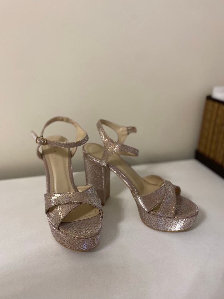 Bej parlak yılan desenli platform topuklu, tokalı kayışlarla klasik zarafet ve çağdaş stil sunar, düğün için uygundur. 37 numara 1 kere nişan için kullanıldı
