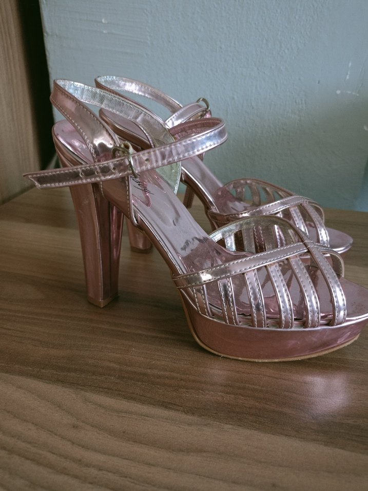 Kadınlar için pembe parlak yılan desenli, tokalı platform topuklu ayakkabılar. Düğünler için şık ve çağdaş bir tarz sunar.