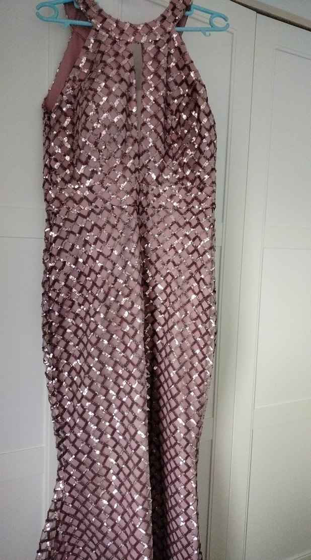 pembe uzun abiye elbise, parıltılı yılan desenli ve payetli detaylara sahiptir. İnce askılı ve V yaka, düğünler için uygundur.