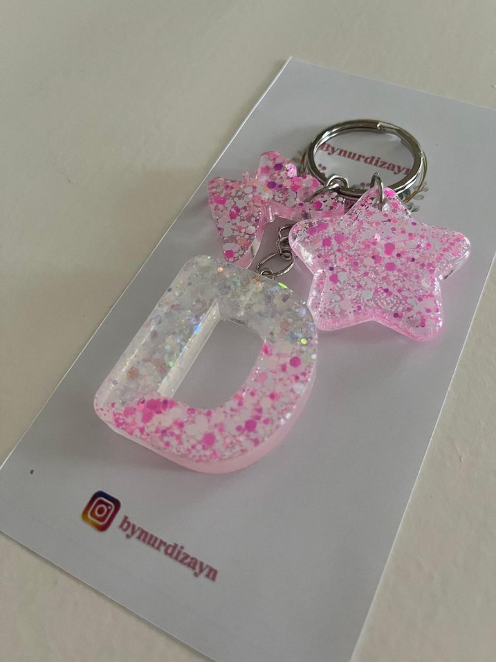 Pembe renkli, simli yıldız ve harf figürlü kadın anahtarlık, rock punk tarzını yansıtır. ✨