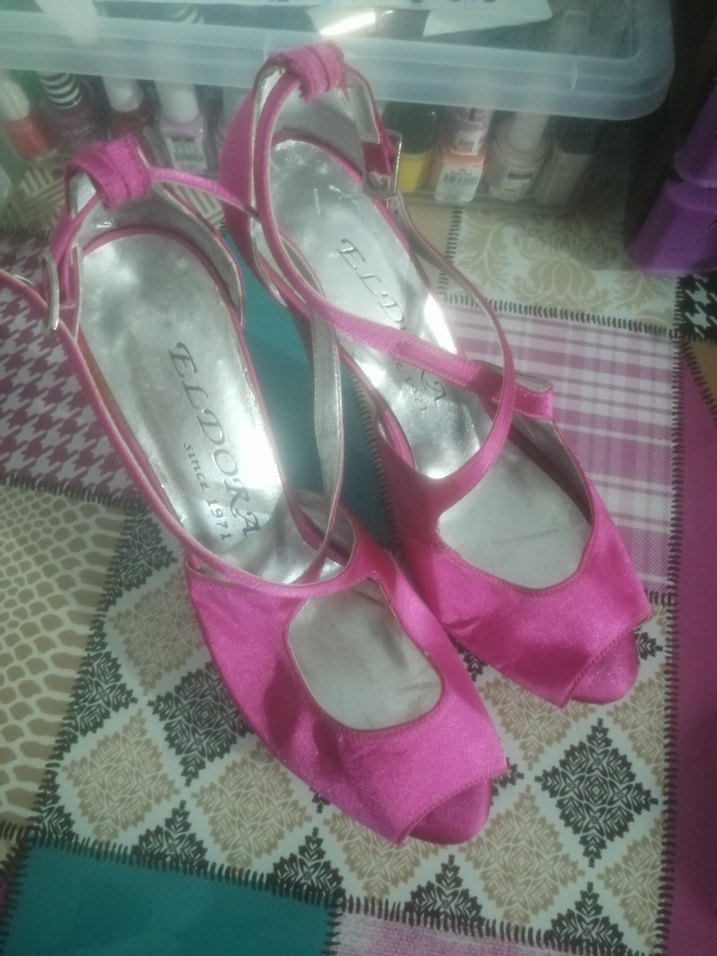 Pembe, parlak, yüksek topuklu abiye ayakkabılar, satenimsi dokuda ve tokalı bant detaylıdır. Düğün ve şık etkinlikler için uygundur, çağdaş ve baskılı tasarıma sahiptir.