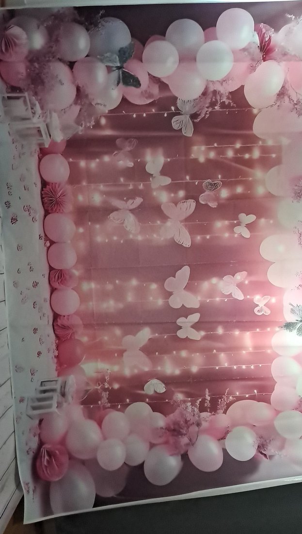 Hafif pembe balonlar ve kelebek süslemelerle oluşturulmuş, ışıklarla yumuşak bir atmosfer sağlayan parti dekorasyonu fotoğraf fonu . 150*205 cm ölçüsünde fonda bant izleri mevcut çekim için sorun olmaz