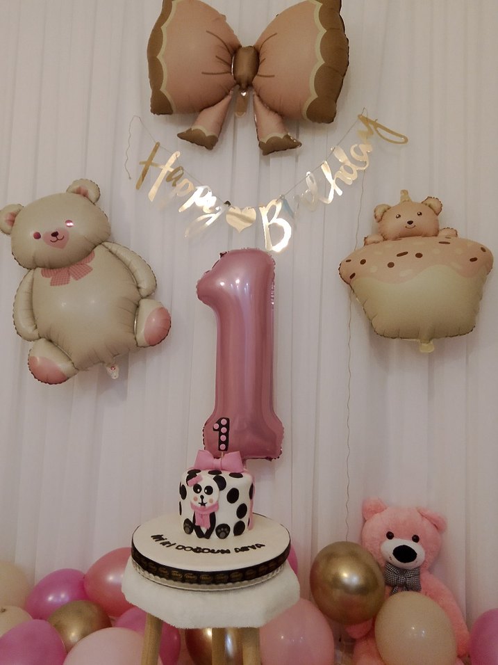 Pembe pastel tonlarda hayvan figürlü balonlar ve 'Happy Birthday' yazılı afiş içeren doğum günü süsleme seti. 1 sayısı patladığından sete dahil değildir. Set içeriği iki ayıcık, bir fiyonk, happy birthday yazısı ve 15 balondan oluşmaktadır.