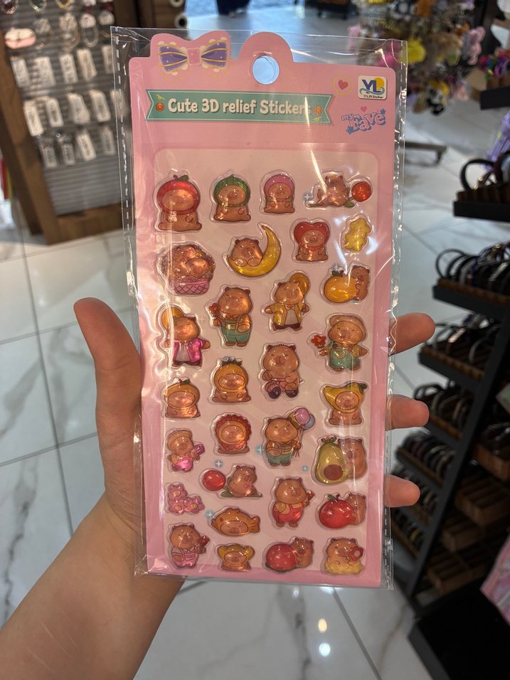 Pastel pembe renkte, çeşitli sevimli figür ve nesnelerden oluşan 3D kabartmalı çocuk sticker seti.