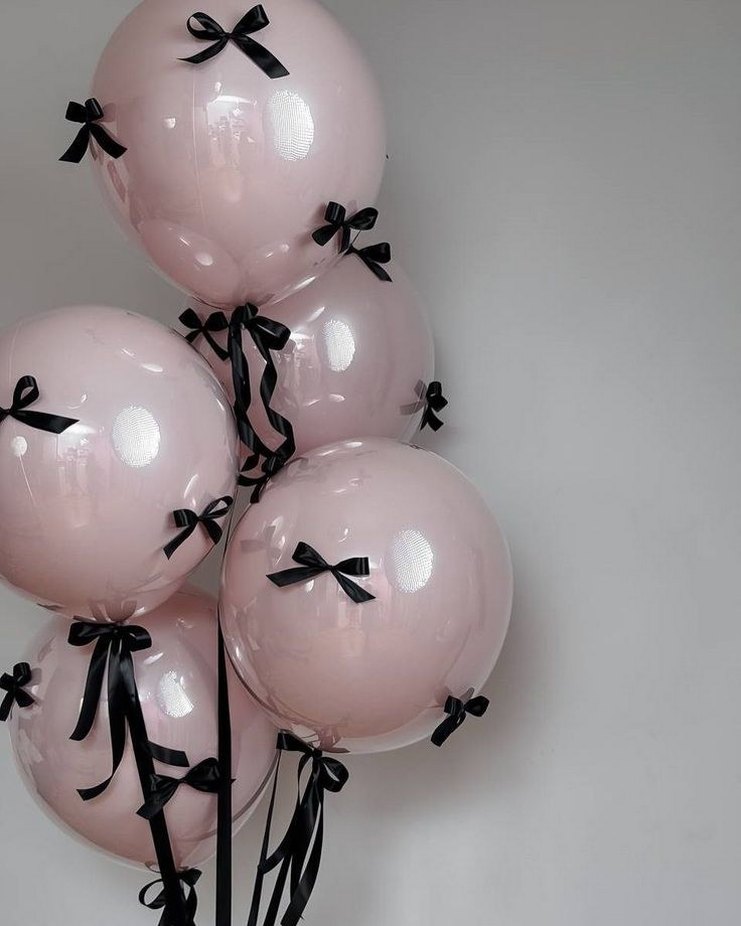 Fiyata 10 adet balon, kurdelalar ve ipler dahildir. Siyah fiyonklarla süslenmiş pastel pembe balonlar, parti süslemeleri için uygun.