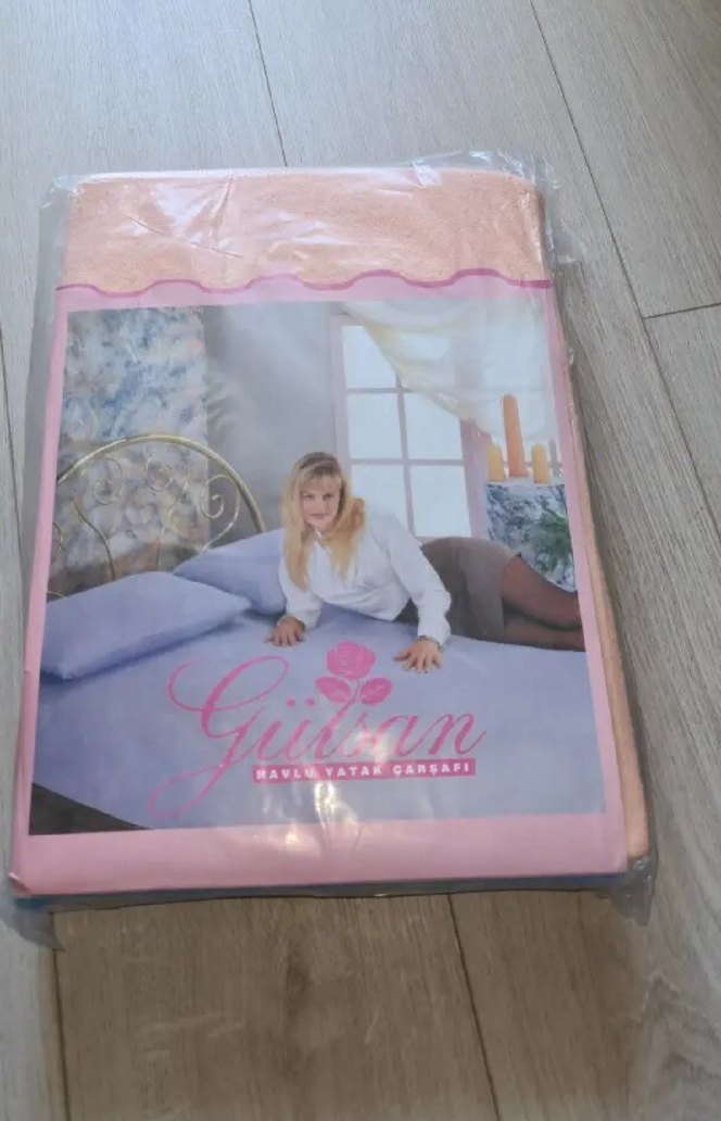 Pembe pastel tonlarında baskılı çarşaf takımı, sıfır paket. 2 adet yastik kilifi ve 1 adet cift kisilik havlu çarşaf bulunmaktadir