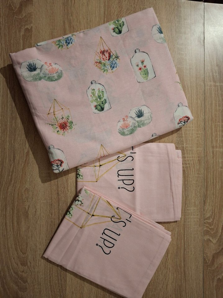 Pembe pastel renkte, bitki ve geometrik şekiller baskılı nevresim takımı, yatak odanıza yumuşak ve hoş bir dokunuş katar . %100 pamuklu.