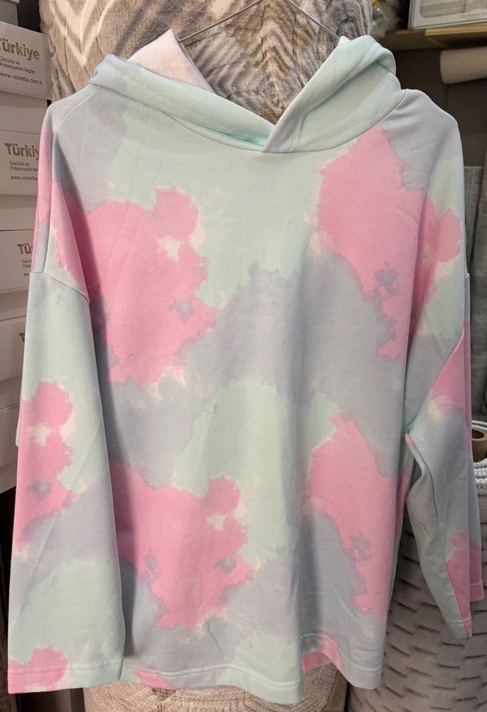Pembe ve mint pastel batik desenli, pamuklu, bol kesim, uzun kollu, yuvarlak yakalı sweatshirt. Rahat ve sokak stiline uygun, günlük kullanıma uygun.