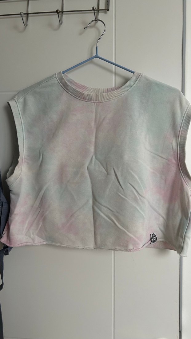 Pastel batik desenli, kolsuz ve yuvarlak yaka crop top. Yumuşak sentetik kumaştan, bol kesim ve normal boyda, günlük kullanıma uygun.iki parçadan oluşuyor içindeki de beyyoğlu marka büstiyer