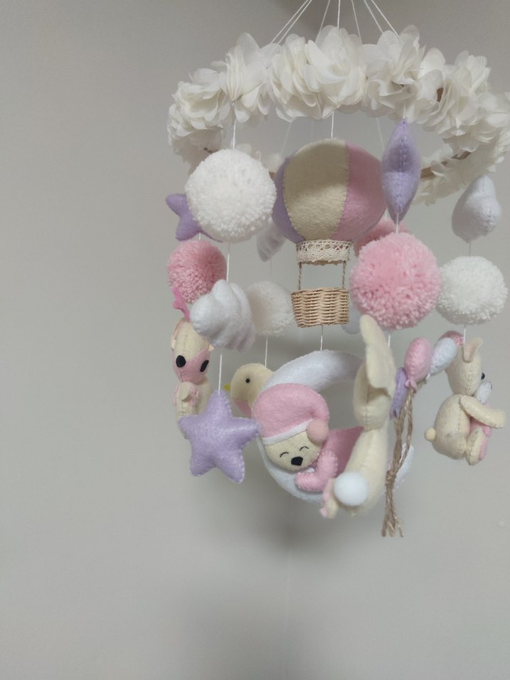 Yumuşak peluş figürler içeren pembe pastel bebek beşiği mobil oyuncak, bebek odası için uygundur.