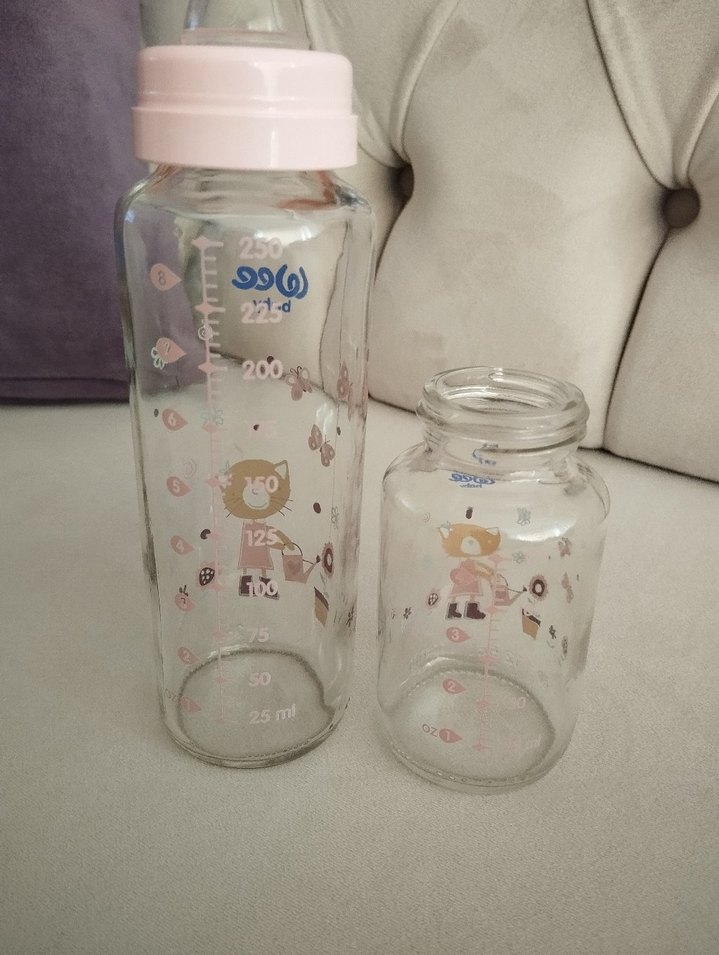Saydam malzemeden yapılmış, ölçü işaretleri ve sevimli hayvan figürleri bulunan pembe pastel bebek biberonları seti.