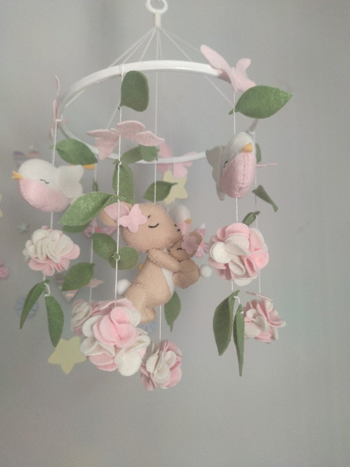 Yumuşak kumaştan yapılmış çiçekler, yapraklar, kuşlar ve ayıcık içeren beyaz halkalı pembe pastel bebek dönencesi. Bebek odası için huzurlu bir ortam sağlar.