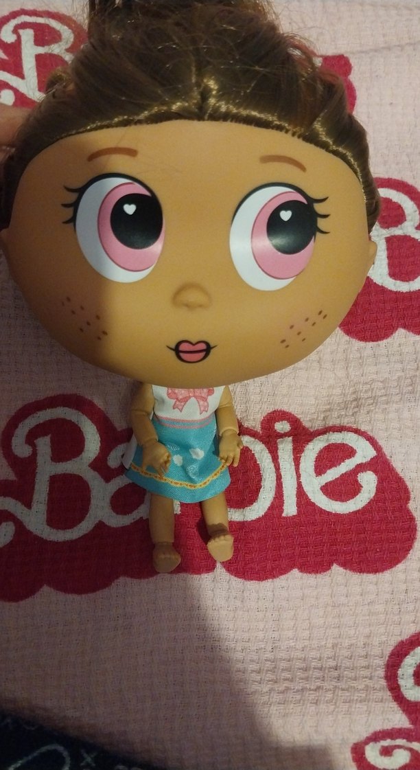 Büyük gözlü, mavi etekli pastel pembe bebek figürü, üzerinde 'Babie' yazılı pembe zeminde oturuyor.