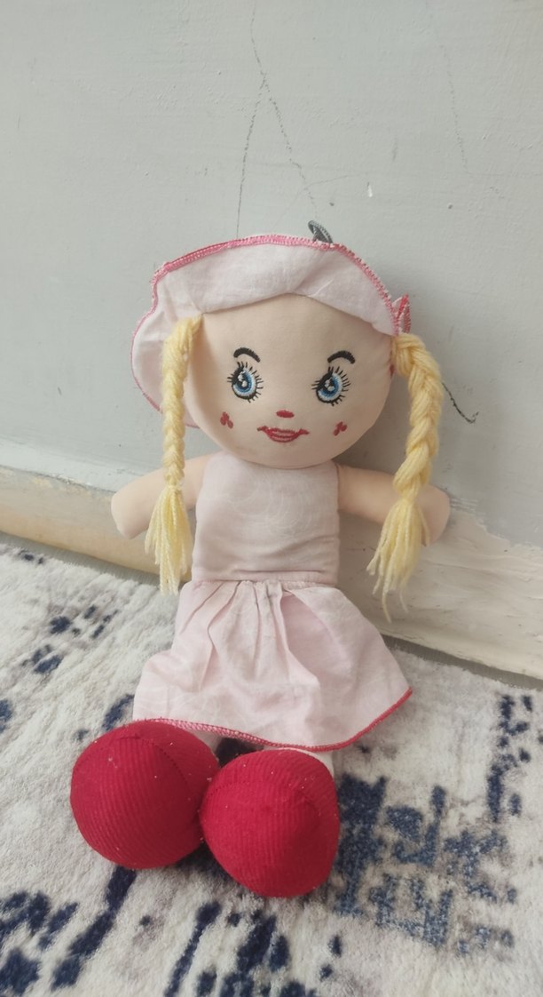 Örgülü sarı saçlı, pastel pembe renkte yumuşak kumaştan yapılmış bebek. Nakışlı yüz ifadeleri ve sade elbiseye sahip.