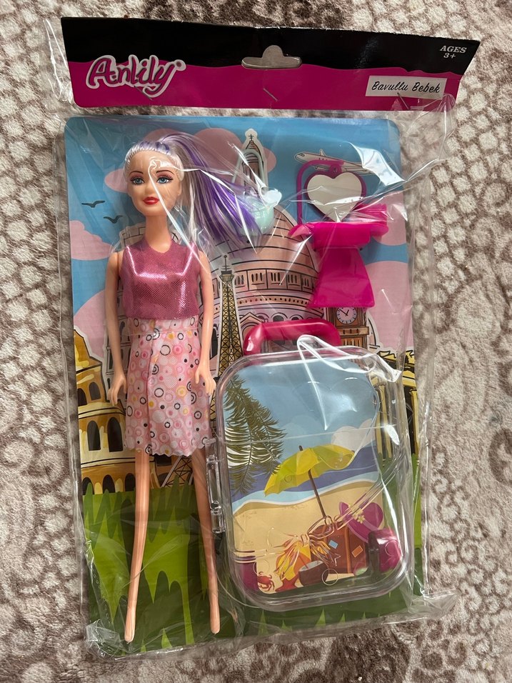 Pembe pastel renkte bebek, desenli etek ve üst ile birlikte küçük bir valiz ve aksesuarlar içerir. 3 yaş ve üzeri için uygundur.