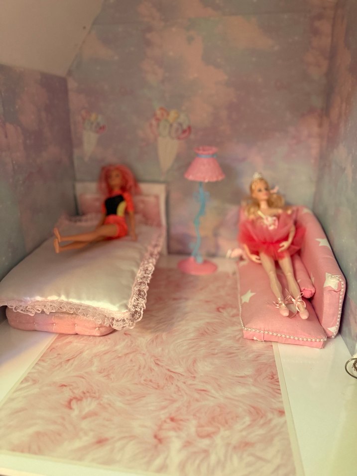 İki bebek, yatak ve kanepe üzerinde pastel pembe tonlarda, yanında uyumlu bir lamba ve yumuşak dokulu halıyla birlikte.