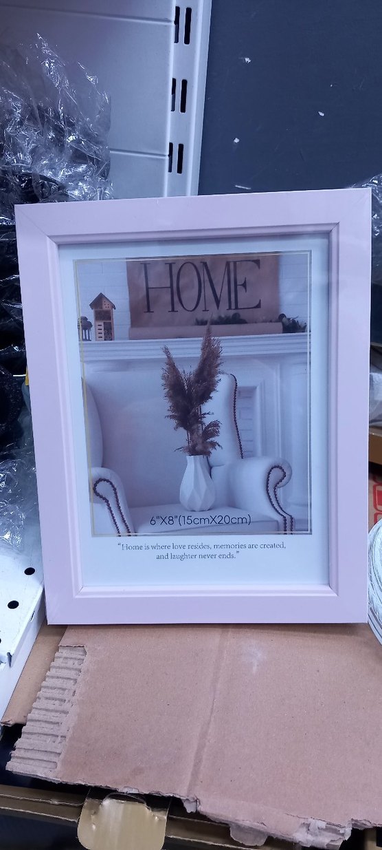 15x20 cm boyutlarında, pembe pastel renkte çerçevede "Home is where love resides, memories are created, and laughter never ends." yazısı yer alıyor. ️