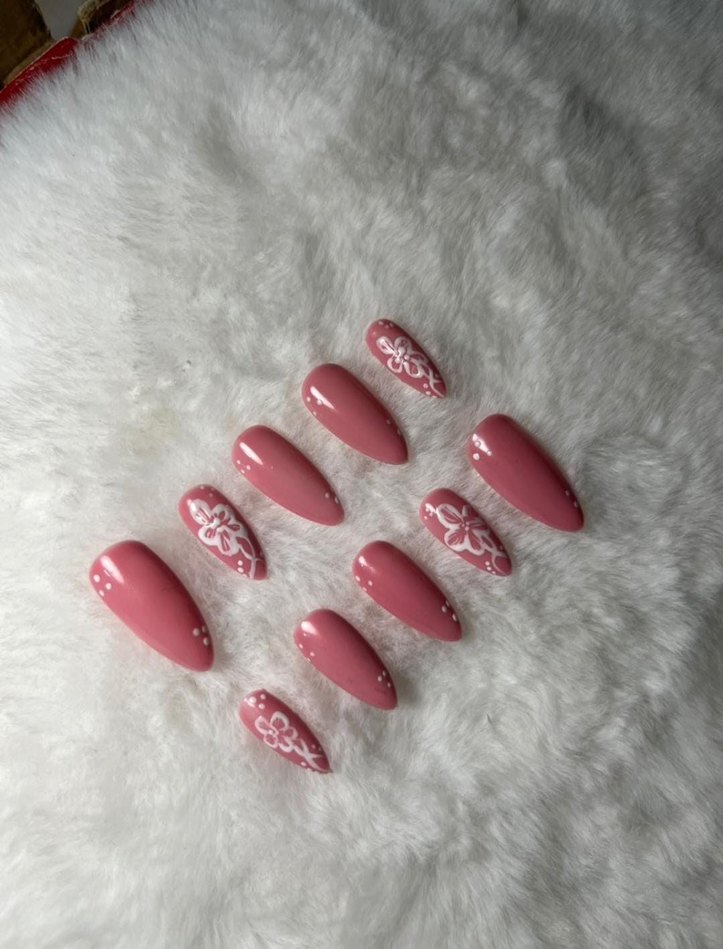 Pembe pastel renkte, çiçek desenli ve parlak yüzeye sahip tırnak süslemeleri, zarif bir görünüm sağlar.