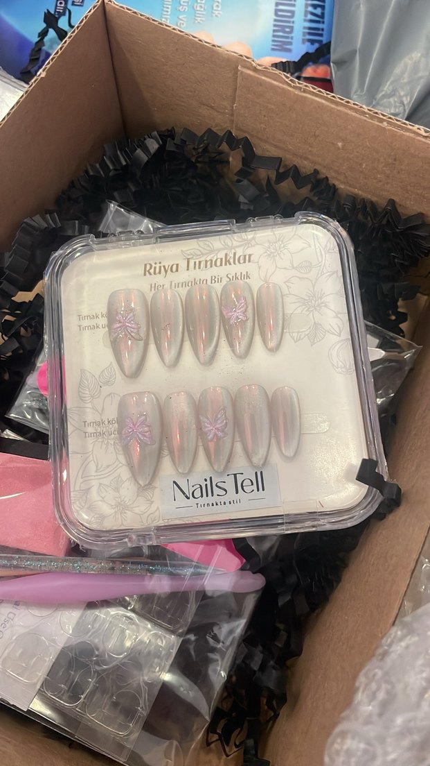 Pastel pembe renkli, çiçek desenli takma tırnak seti. Yumuşak ve zarif bir görünüm sunar. NailsTell markalı. Bedenleri ; xs , s, m, l