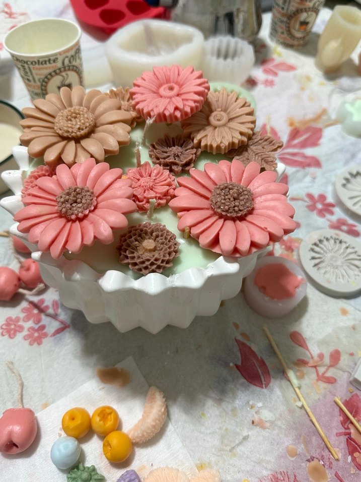 Pastel pembe renkli, üzeri detaylı çiçek motifleriyle süslenmiş mum. Beyaz dalgalı bir tutucuda sunulur, şık ve dekoratif bir görünüm sağlar.