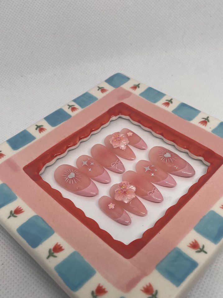 Her bir set özenle hazırlanmış, yalnızca 1 adet stokla sınırlıdır. Tırnaklar kalıcı oje ile uygulanmış, yüksek kaliteli malzemeler kullanılmıştır. Paket İçeriği: • 1 set takma tırnak • Takma tırnak uygulama kiti • Küçük bir sürpriz hediye Siparişiniz özenle paketlenir ve en kısa sürede kargoya verilir. Güle güle ve keyifle kullanmanızı dilerim!