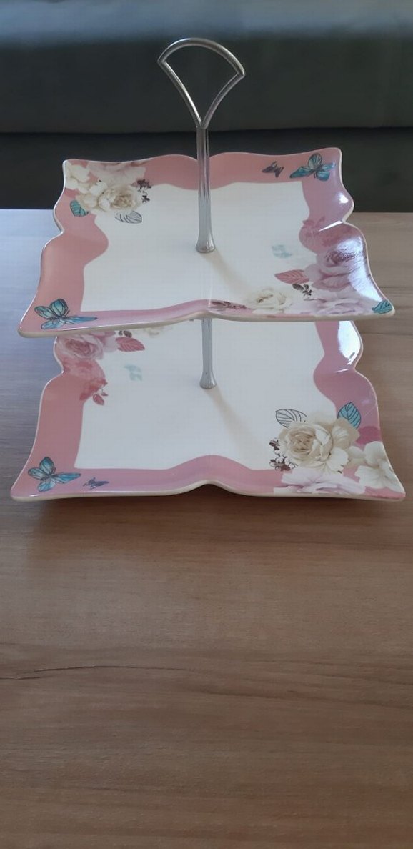Çiçek ve kelebek desenli, pembe pastel tonlarında çift katlı servis tabağı, atıştırmalık ve tatlılar için uygun.
