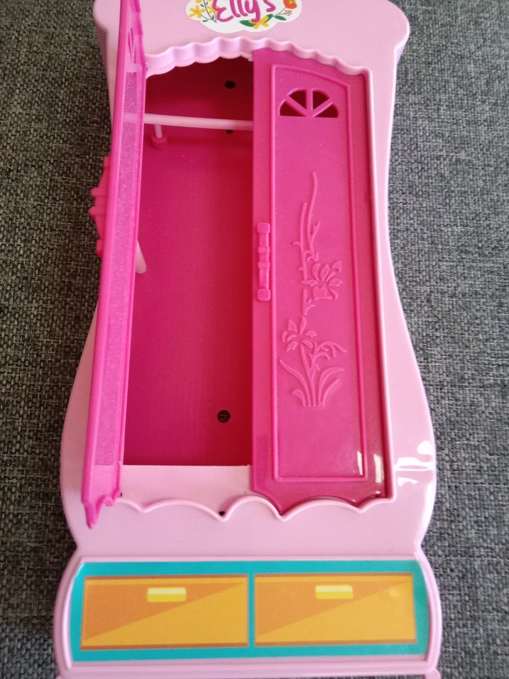 Pembe pastel renkte, çiçek desenli kapakları ve alt kısmında iki çekmecesi olan çocuk dolabı oyuncak. İçinde askılık yer alır.
