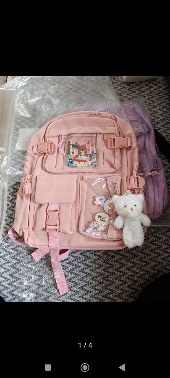 Çoklu ön cepler ve toka detayları bulunan pembe pastel çocuk okul çantası, şeffaf cepte dekoratif rozetler ve küçük beyaz ayıcık anahtarlık içerir.