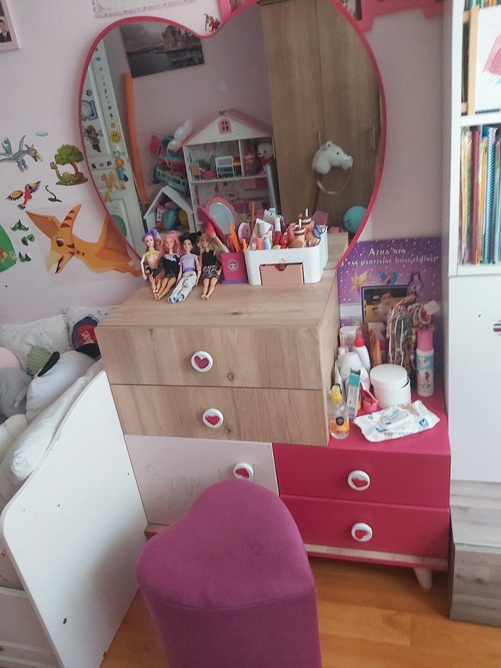 Pastel pembe renkte, kalp şeklinde kulpları ve kalp ayna detayı olan çocuk şifonyeri ve kitaplik kargo olmuyor ist.