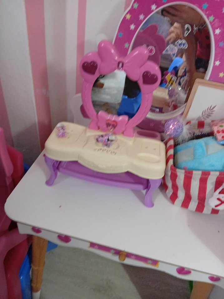 Pastel pembe renkte, kalpli aynası ve dekoratif detayları olan çocuk şifonyeri. Küçük eşyalar için masa üstü alan sunar.