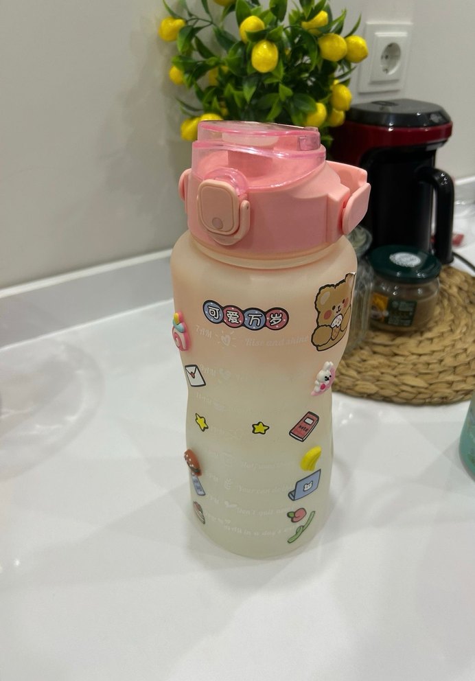 Pembe pastel renkte, kilitli kapaklı ve eğlenceli çizgi film desenlerine sahip çocuk termos matara.