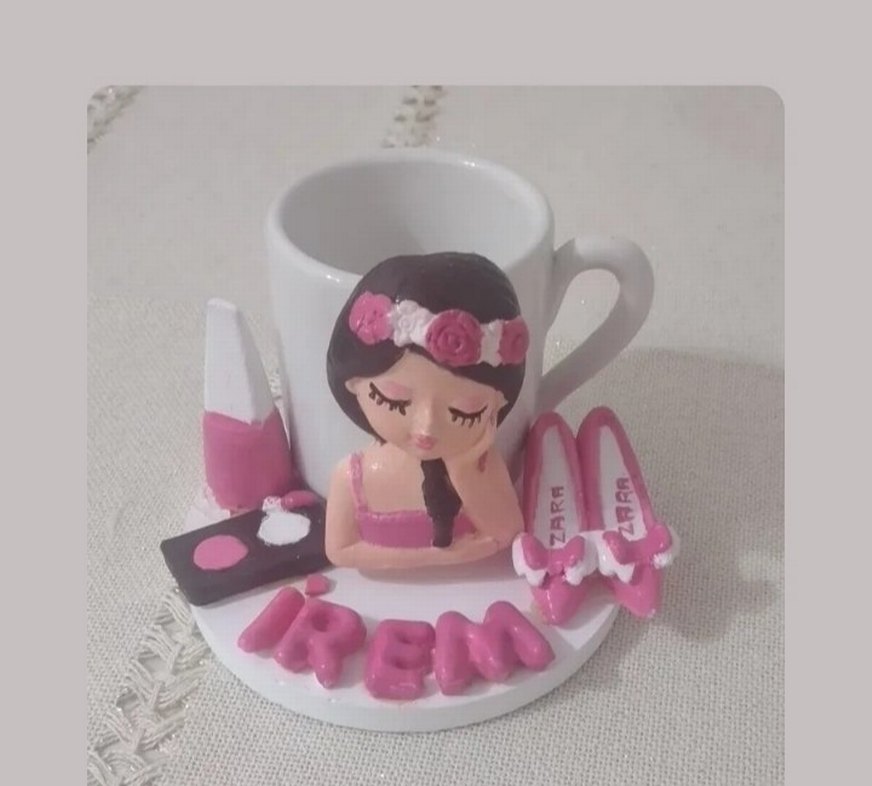 Beyaz kupa, pembe pastel dekoratif taban üzerinde çiçekli taç takan kız figürü, makyaj malzemeleri ve ayakkabılarla süslenmiştir.