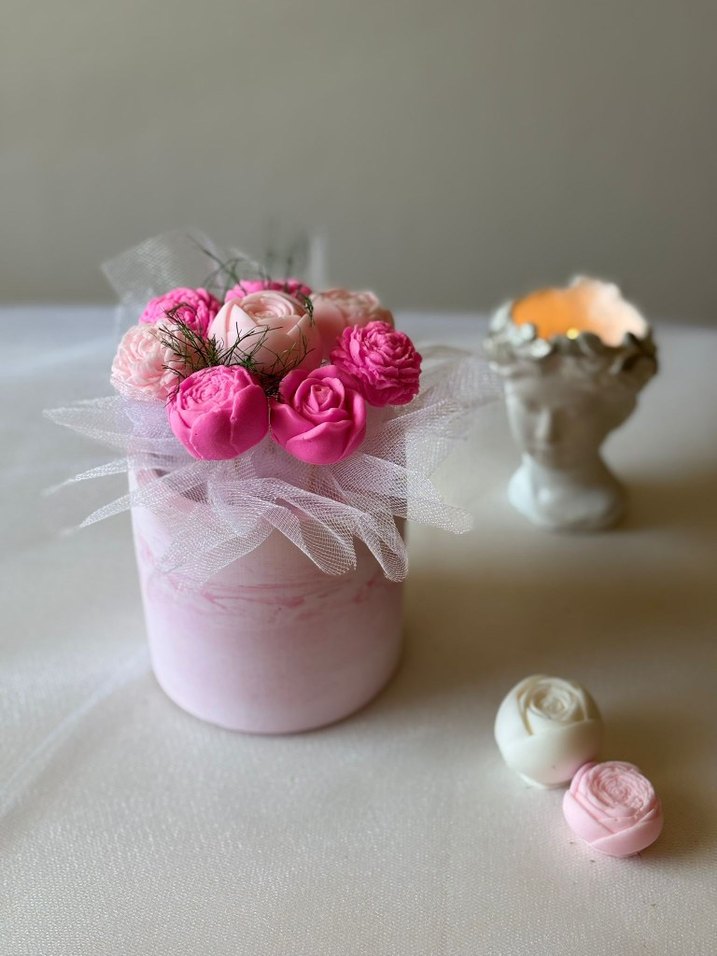 Yumuşak tül ve narin pembe çiçeklerle süslenmiş pastel pembe dekoratif sabun