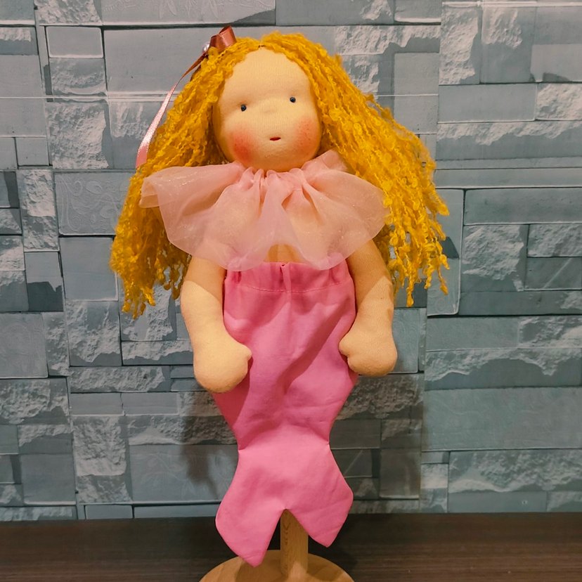 Yumuşak kumaştan yapılmış, pastel pembe renkli deniz kızı bebek, sarı ipten saç ve ince tül yakaya sahiptir.