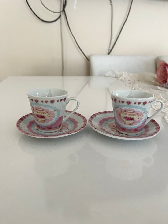 Pastel pembe renkli, çiçek desenli ve kulplu iki kahve fincanı ve tabak seti. ☕