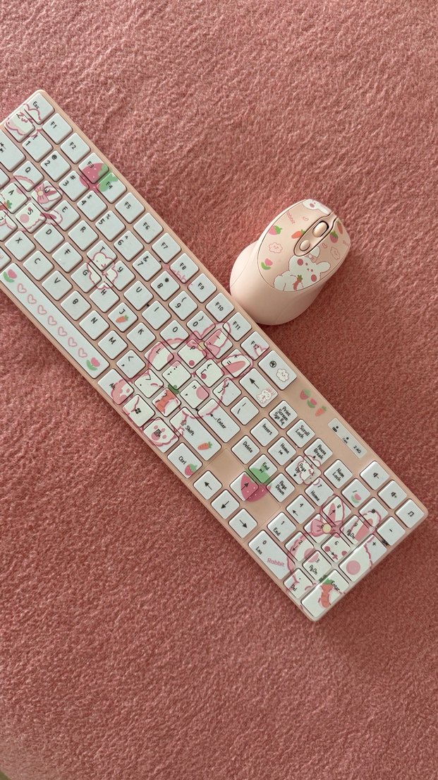 Pastel pembe renkli, sevimli desenlerle süslenmiş kablosuz klavye ve mouse seti.