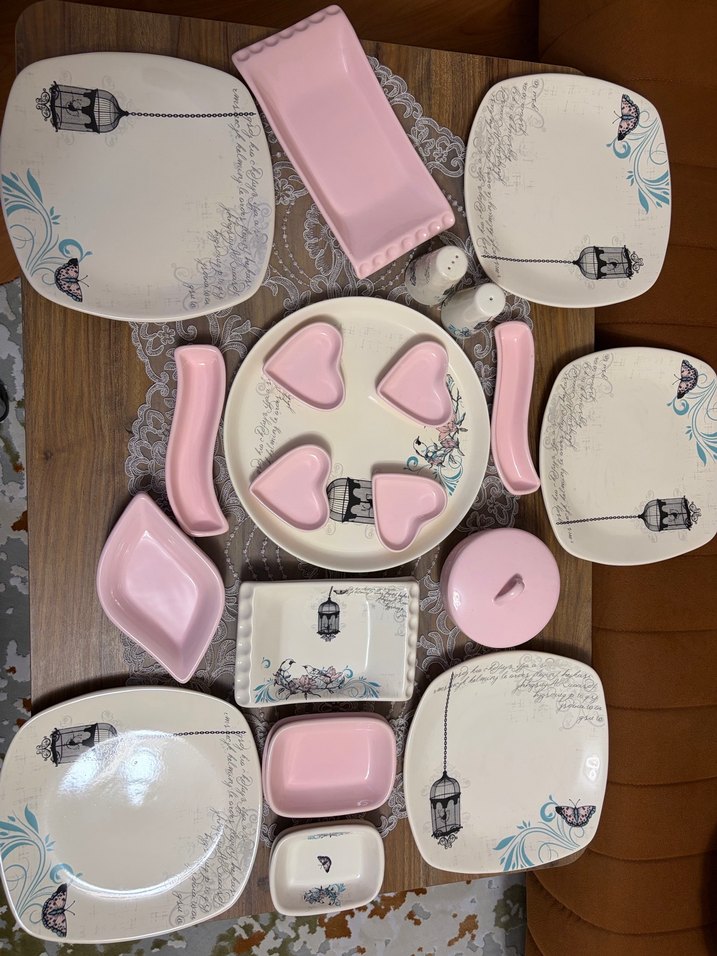 Pembe pastel tonlarında, kelebek ve fener desenli çeşitli tabak ve kaplardan oluşan kahvaltı takımıdır. ️