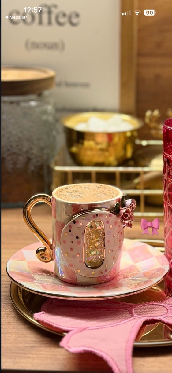 Pembe pastel renkte seramik fincan ve tabağı, parlak yüzey ve altın detaylarla süslenmiştir. Kulpta çiçek detayı bulunur. ☕
