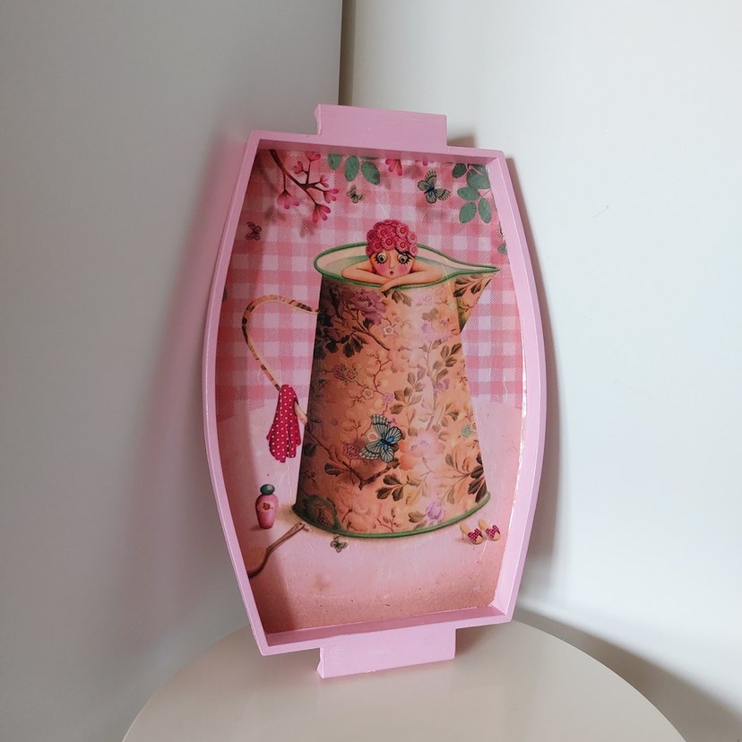 Pembe pastel renkte, çiçek desenli ve içinde sevimli bir karakter bulunan eğlenceli bir çaydanlık figürlü tepsi.