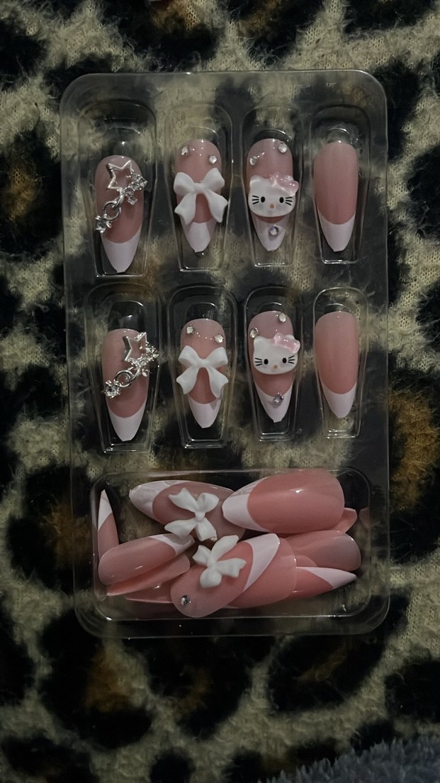 Fiyonk, yıldız ve sevimli kedi desenli taşlı pembe pastel tırnak süsleri. Tırnaklara şıklık katmak için ideal. Hiç kullanılmadı kutusuyla gönderilecektir