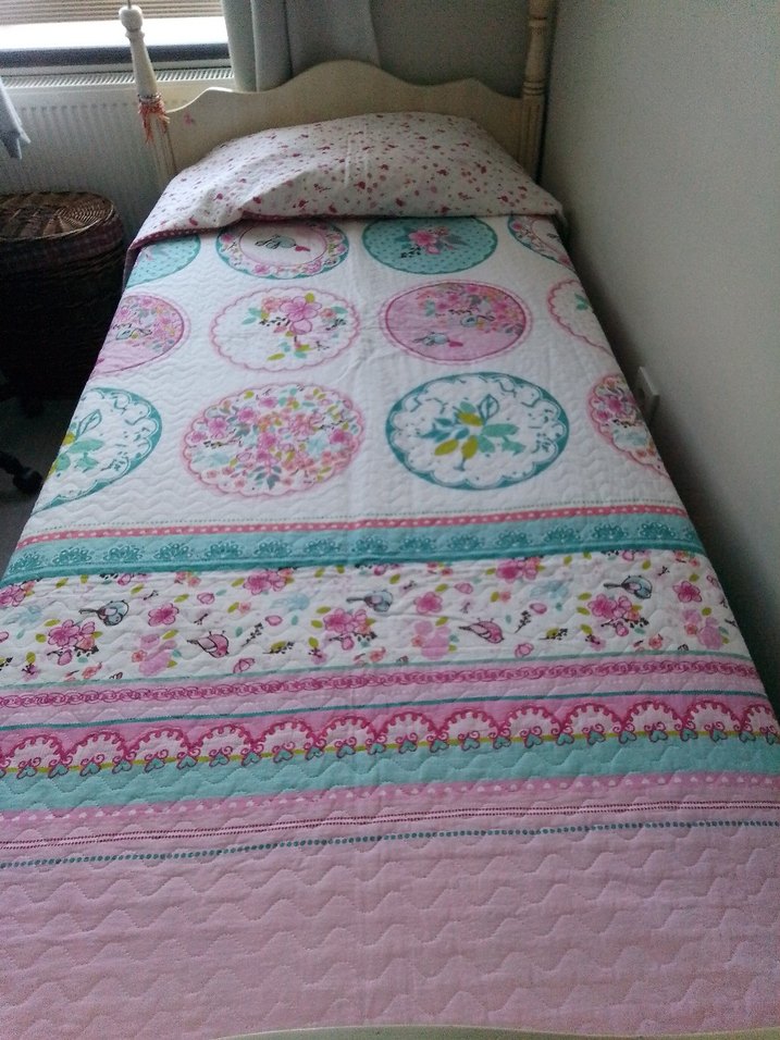 Pembe pastel renkte, çiçekli ve dairesel desenlere sahip yatak örtüsü, yatak odasına yumuşak ve şirin bir hava katıyor.