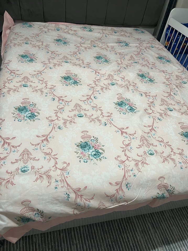 Bu yatak örtüsü, pembe pastel tonlarda baskılı çiçek desenlerine sahiptir. Yatak odasına yumuşak ve zarif bir dokunuş katar. Yorgan yüzü yazlık pike iki yastıktan oluşmaktadır çarşafı yoktur yastıklar kullanıma bağlı sadece solmuştur diğerleri kullanılmadı