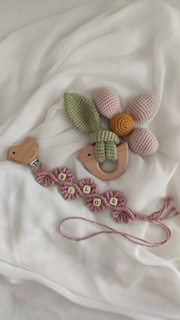 pembe çiçek şeklinde diş kaşıyıcı ve pembe örgü emzik askısı seti.