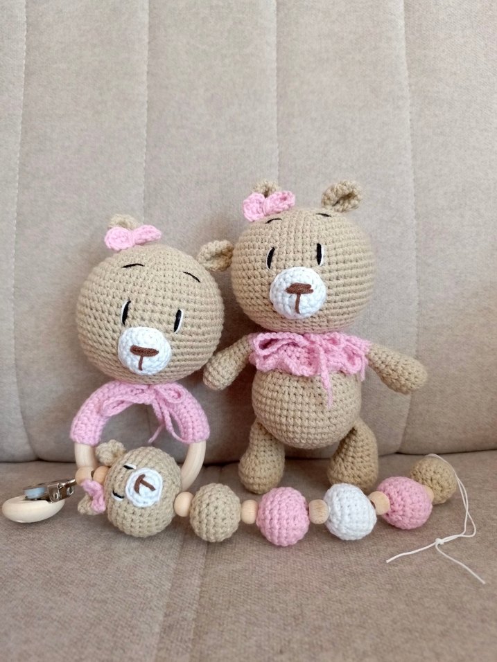 Pembe pastel tonlarında, yumuşak boncuklu diş kaşıyıcı ve el yapımı örgü ayıcık oyuncak seti.