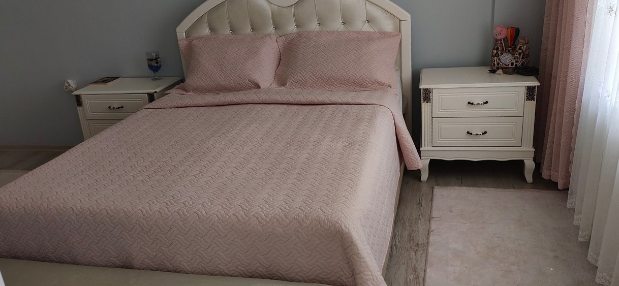 Pastel pembe renkli, hafif dokulu desenli, sade görünümlü yatak örtüsü. Yumuşak ve huzurlu bir atmosfer sağlar.