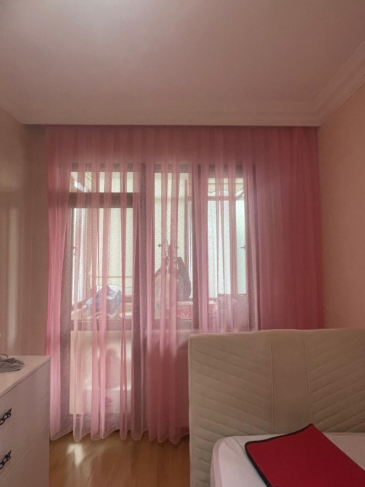 Pastel pembe renkte, düz desenli, tül perde. 250 cm eni