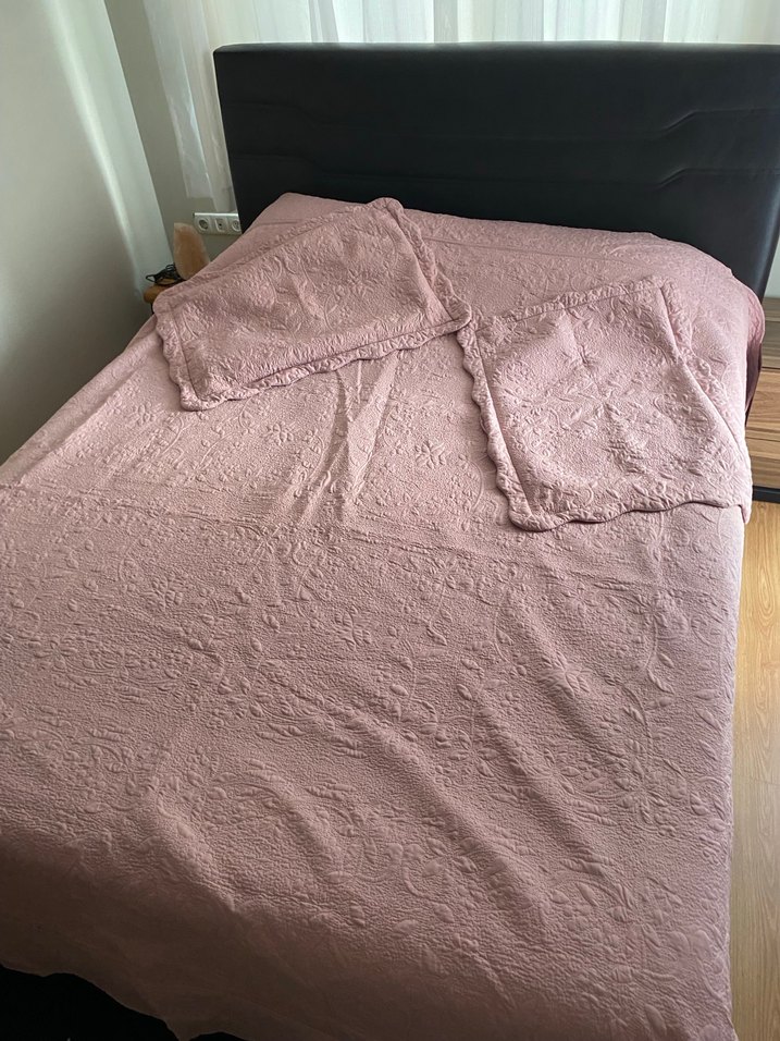 Pastel pembe renkli, hafif dokulu desenli yatak örtüsü ve uyumlu yastık kılıfları. Yumuşak ve rahat kumaştan üretilmiştir. ️
