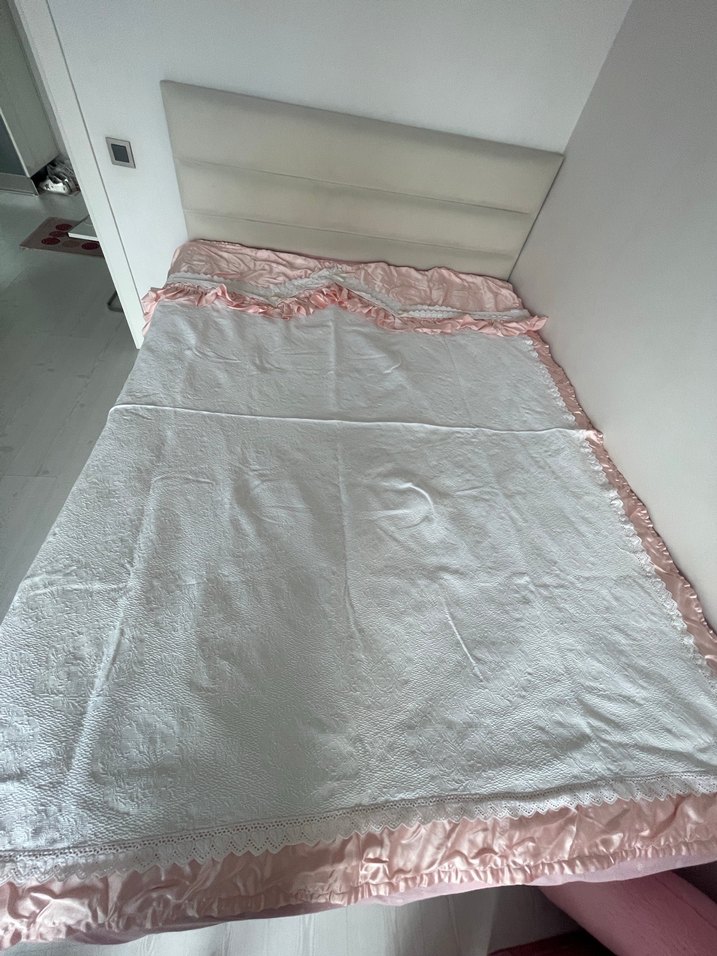 Yatak örtüsü, kenarlarında hafif parlaklık ve yumuşak pastel pembe renge sahiptir. Düz ve sade tasarımıyla yatak odasına nazik bir dokunuş katar.