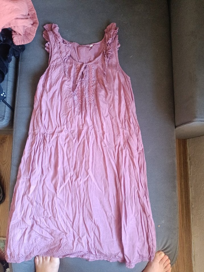 Pembe pastel renkte, kolsuz, V yakalı, midi boy, bol kesim . Rahat kullanım sağlar.